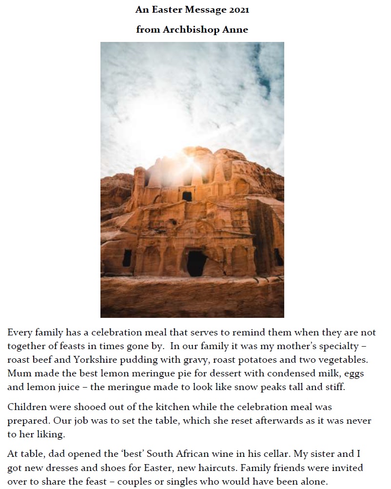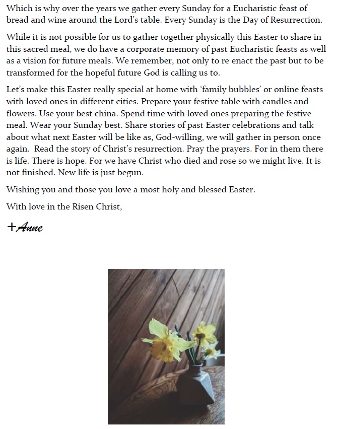 Archbishop Anne Germond’s Easter Letter Archbishop Comments Off on Archbishop Anne Germond’s Easter Letter Apr 042021 Share this: Share on Facebook (Opens in new window) Facebook More Print (Opens in new window) Print Share on X (Opens in new window) X Email a link to a friend (Opens in new window) Email